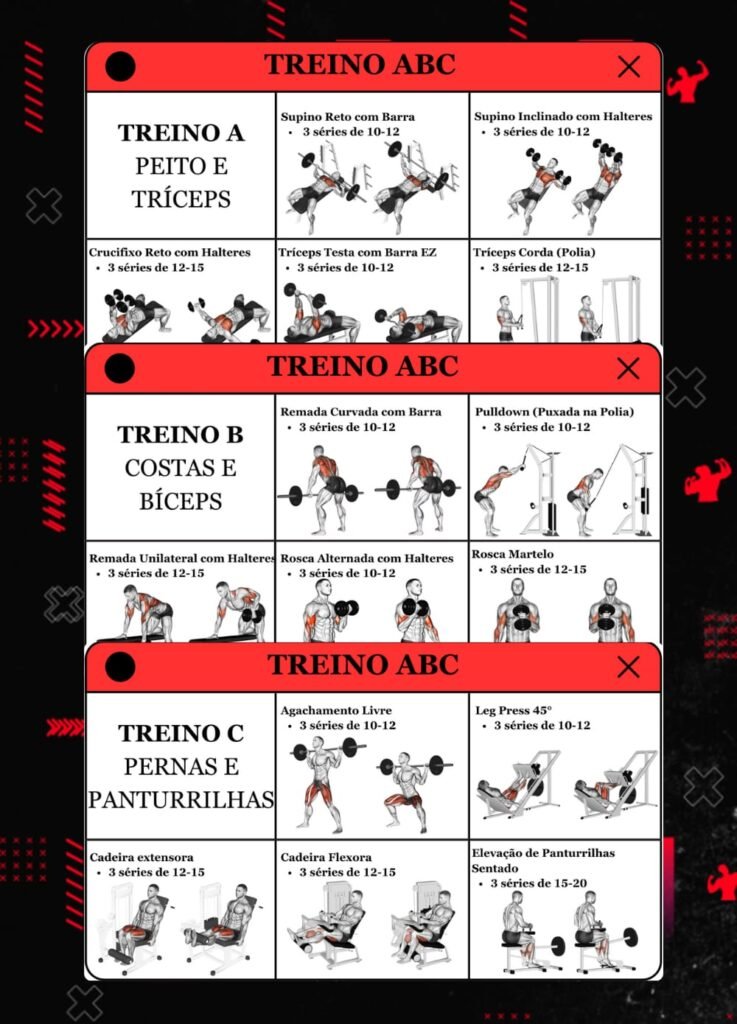 Com fichas ilustradas, você identifica facilmente cada exercício e segue treinos completos nos formatos AB, ABC e ABCD, sem ficar perdido nos nomes técnicos.